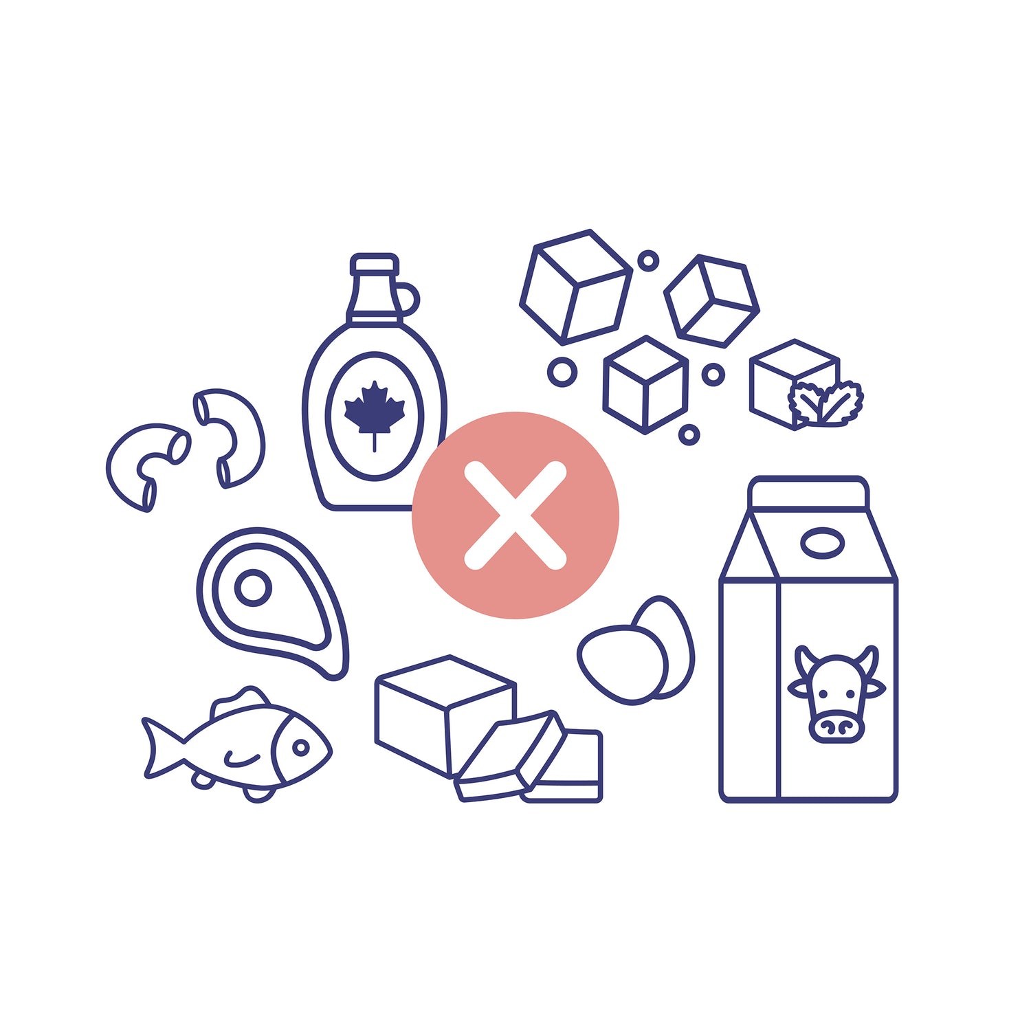 ✘ tierische Produkte wie Fleisch, Fisch, Milch(produkte) und Eier